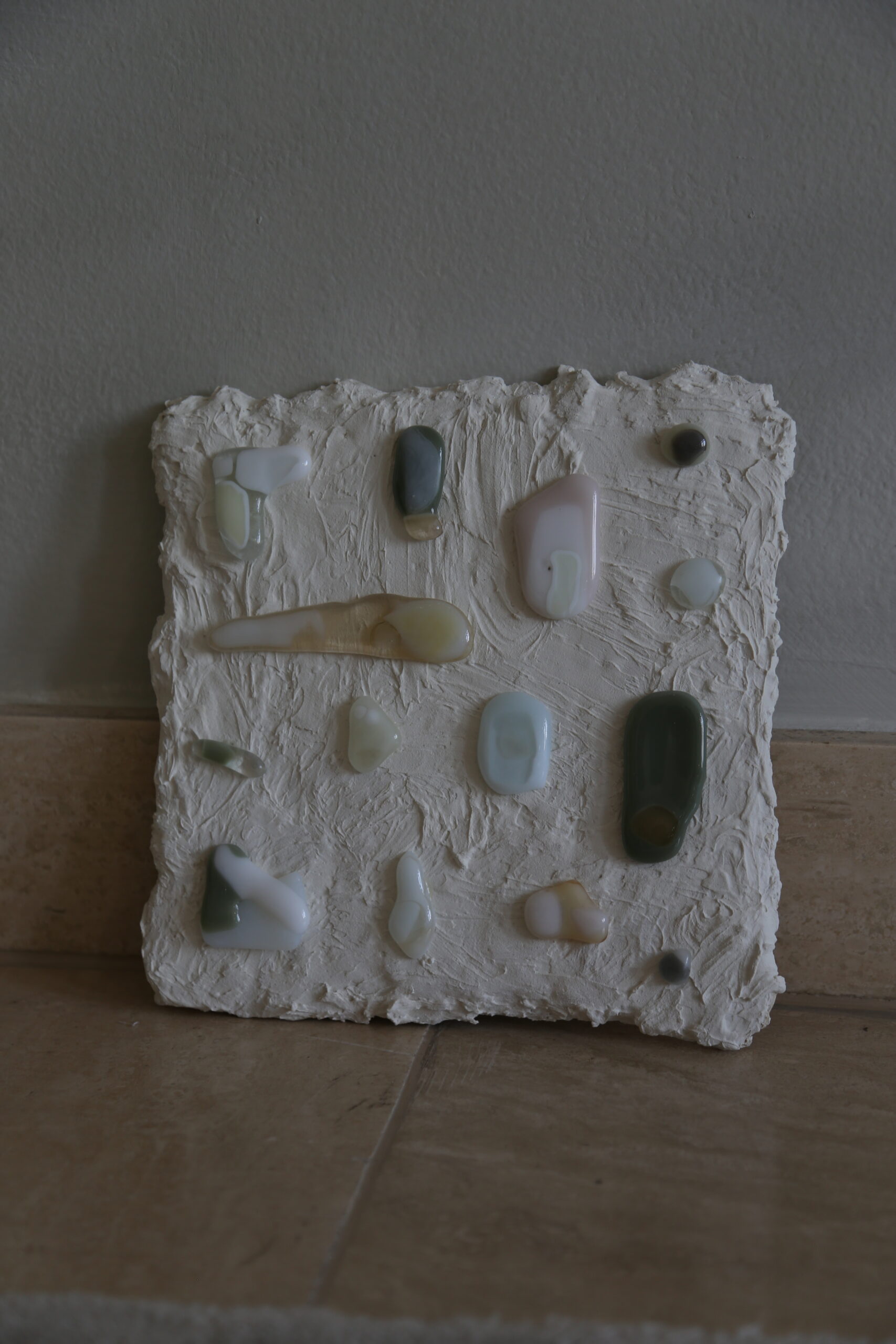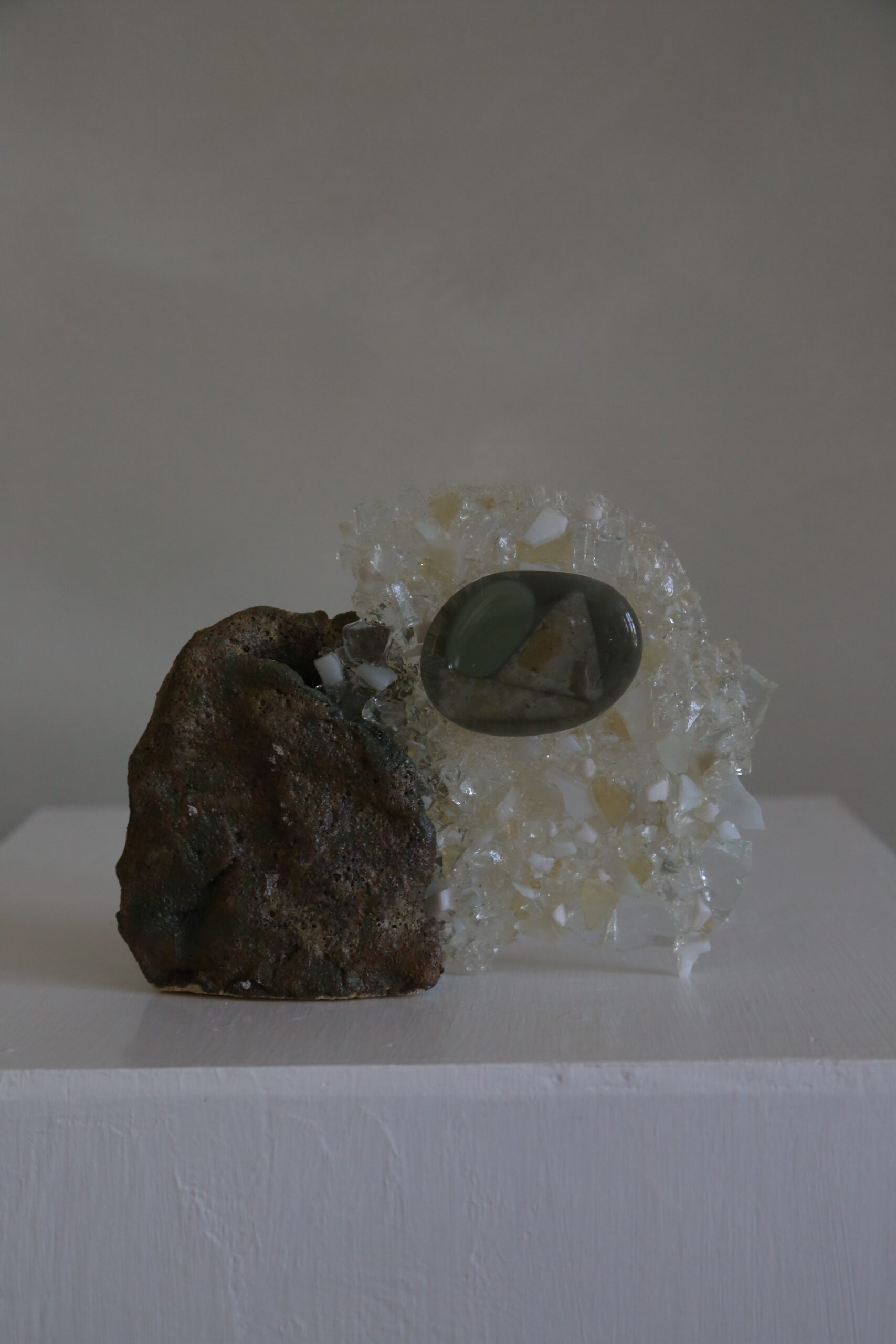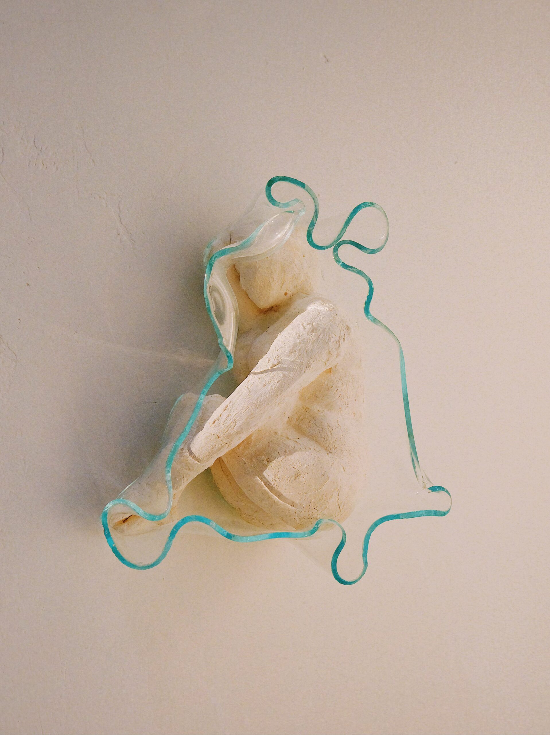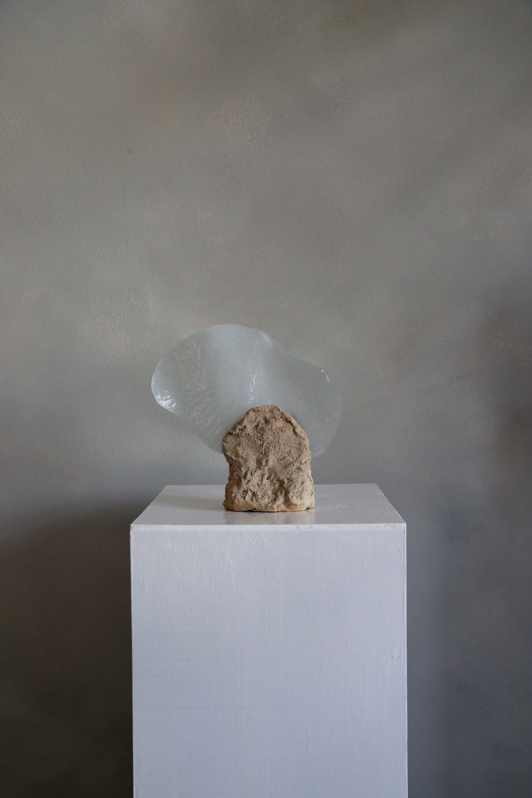 “escape" is a mixed media sculpture. the body of the object is formed by pieces morrocan sand clay, while the wave or the cover is fused glass. the sculpture fits many moods as when the body is under the glass it is a feeling of trapped and grief, and when turned over the body is riding the glass wave and gives a sense of freedom.