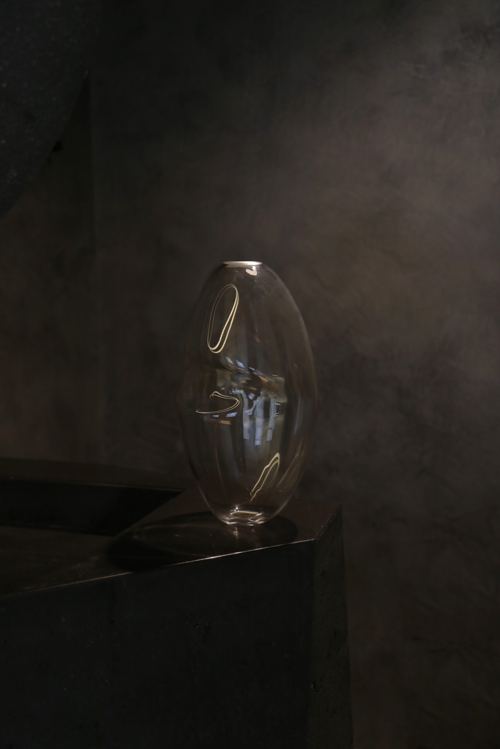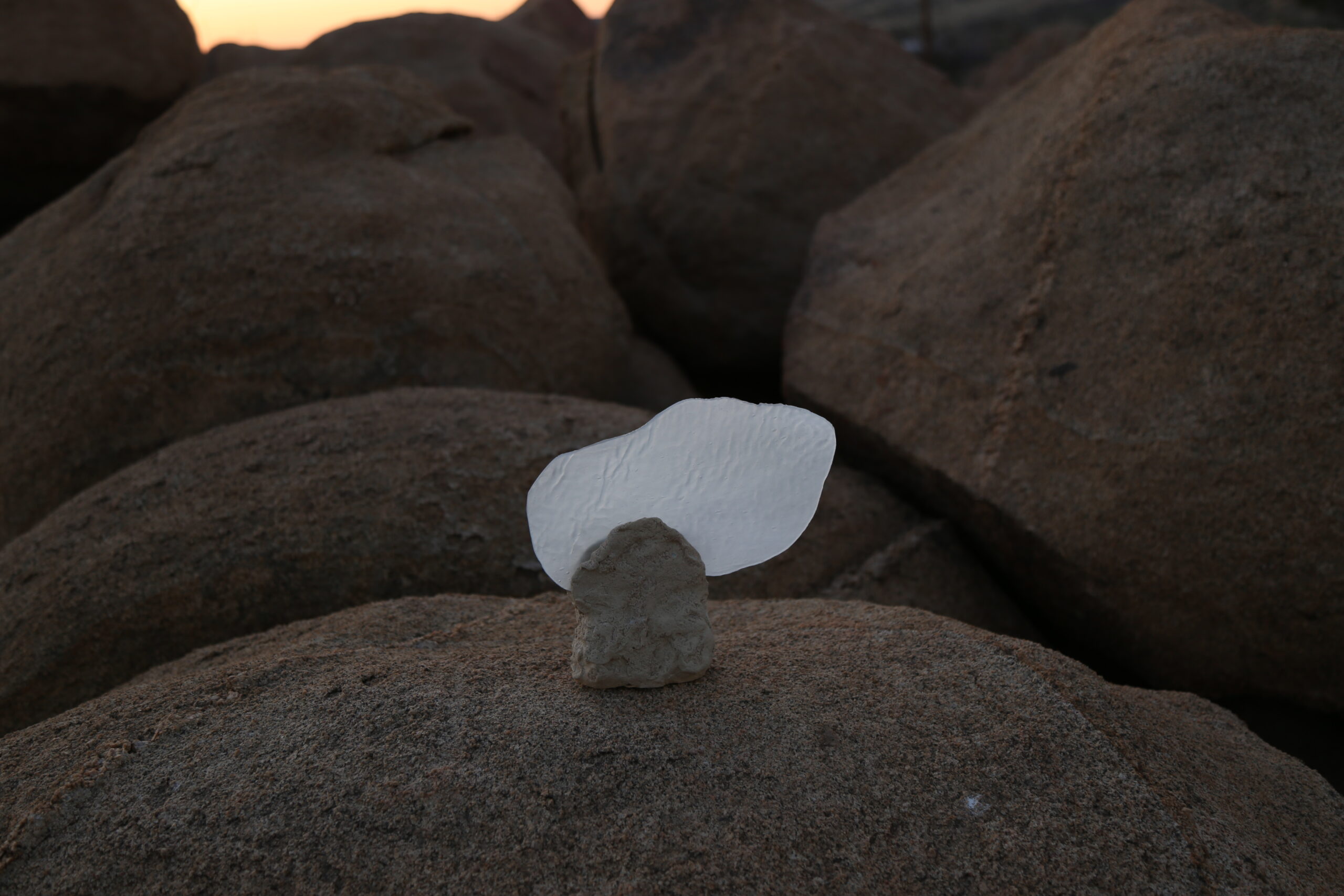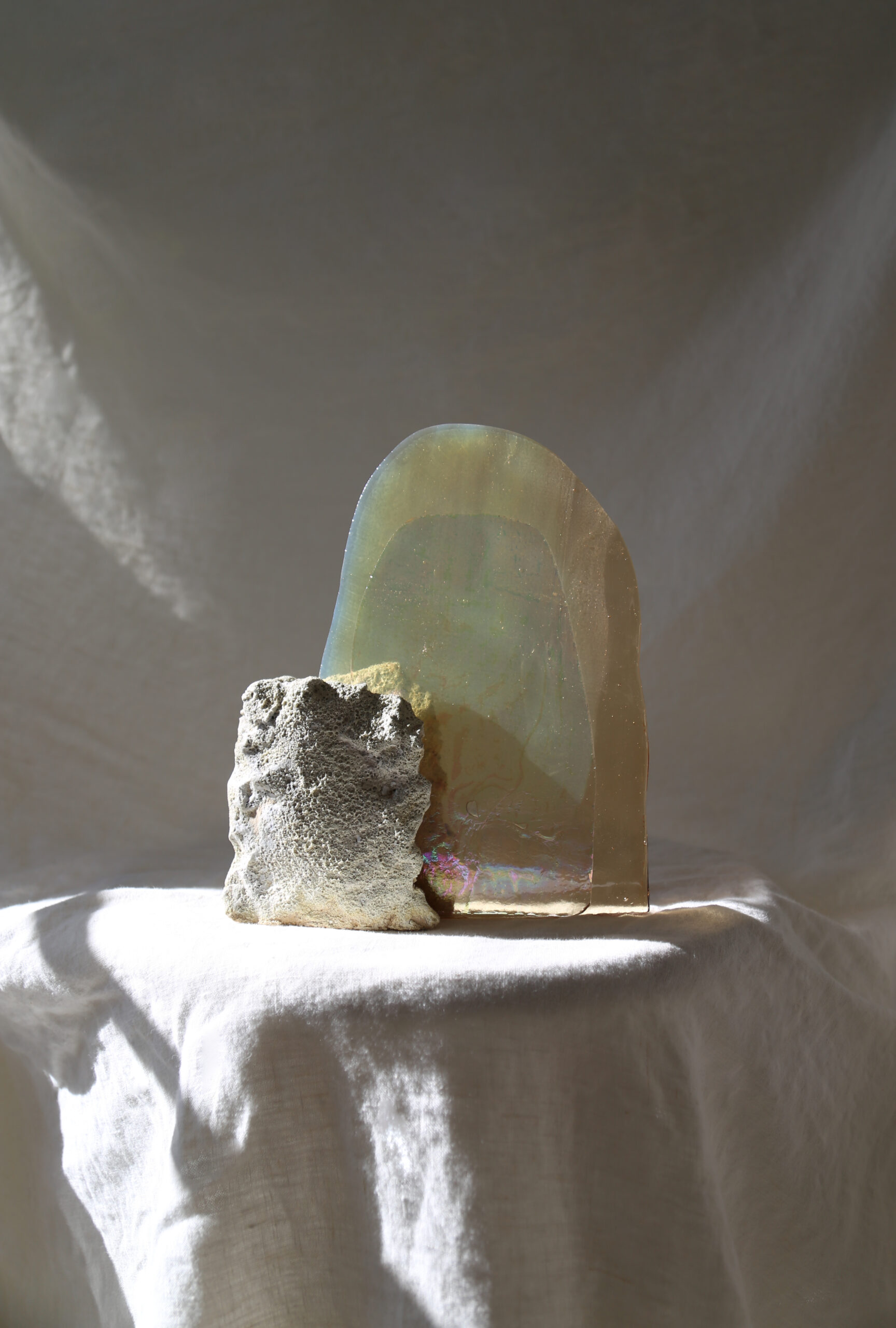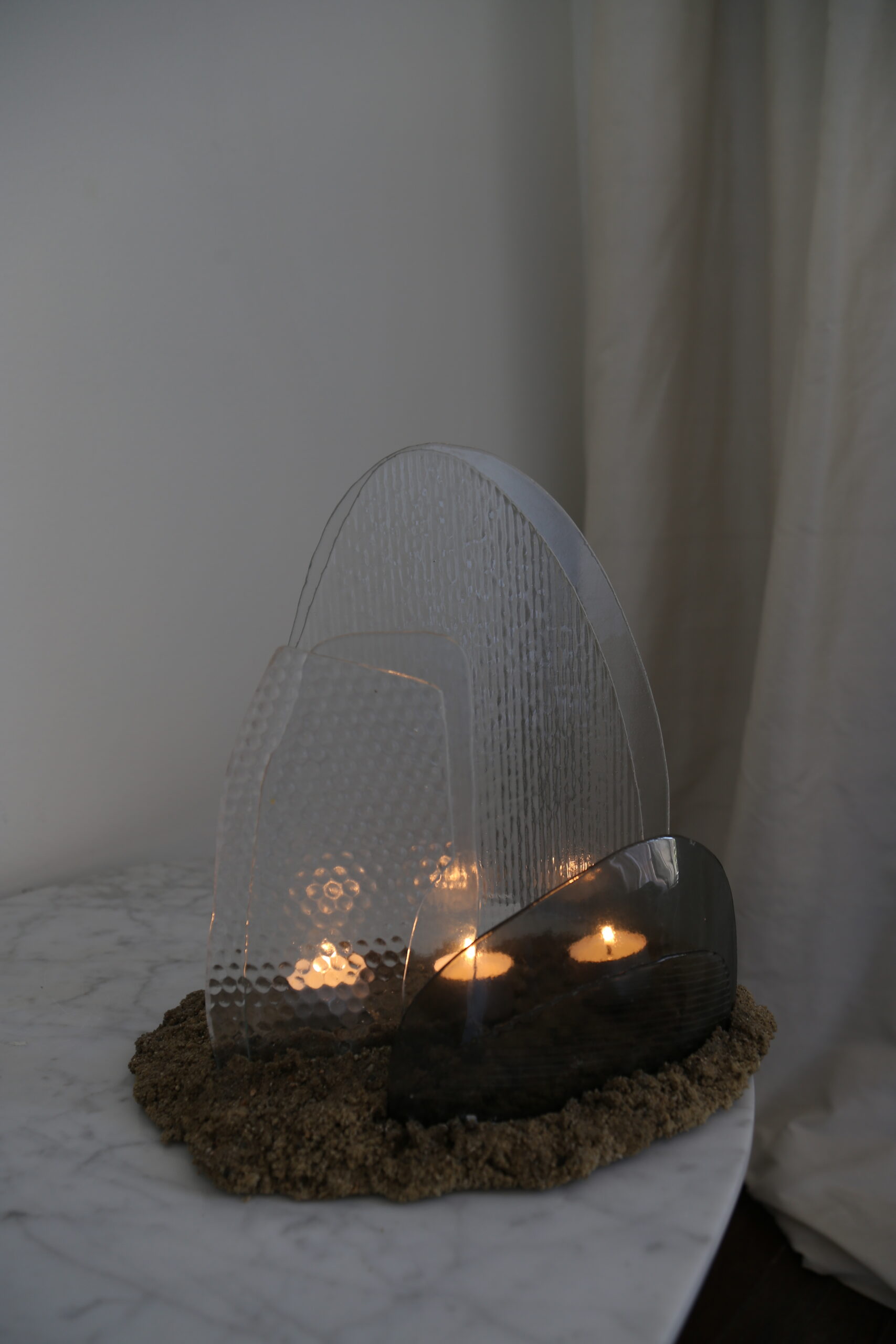 “escape" is a mixed media sculpture. the body of the object is formed by pieces morrocan sand clay, while the wave or the cover is fused glass. the sculpture fits many moods as when the body is under the glass it is a feeling of trapped and grief, and when turned over the body is riding the glass wave and gives a sense of freedom.